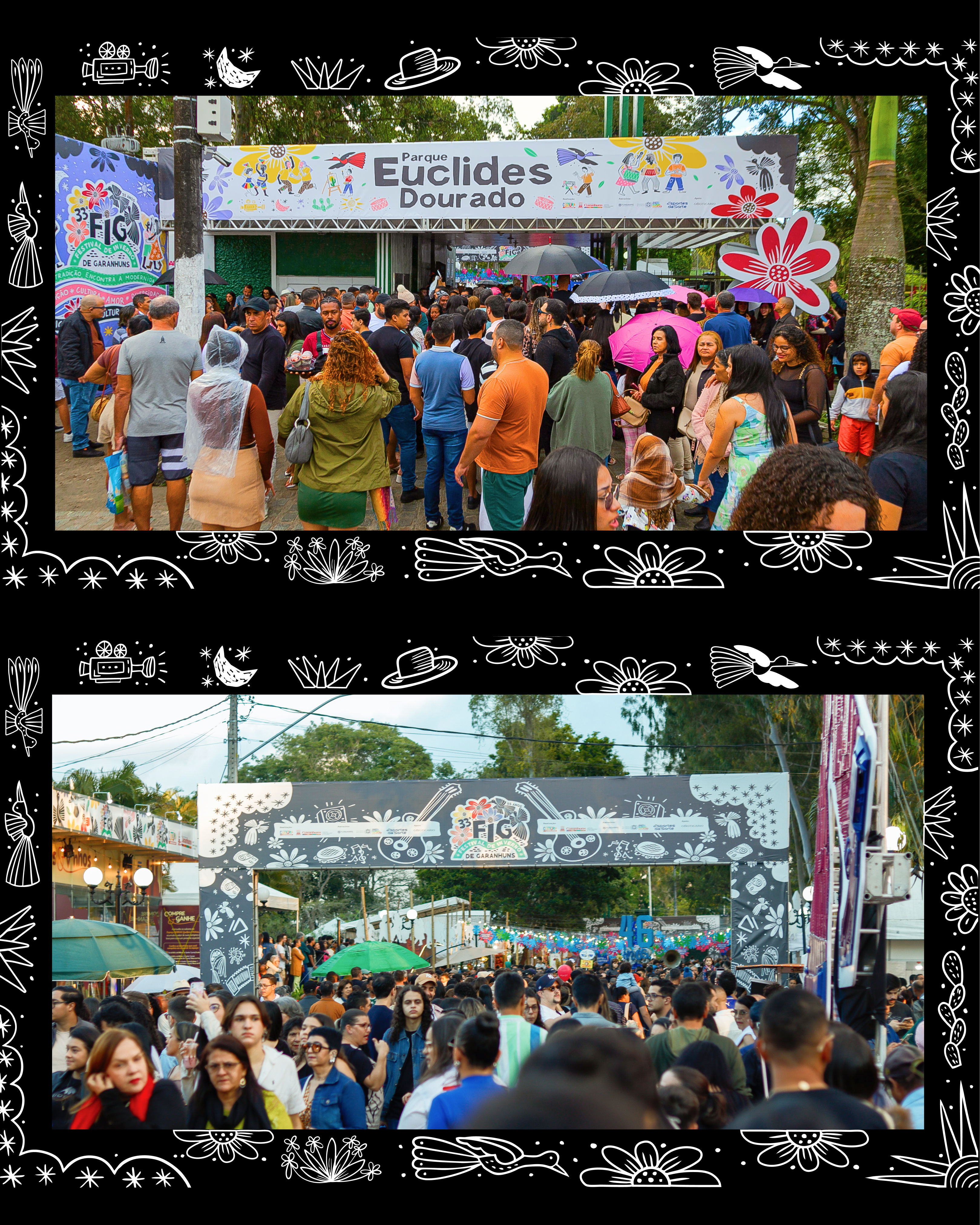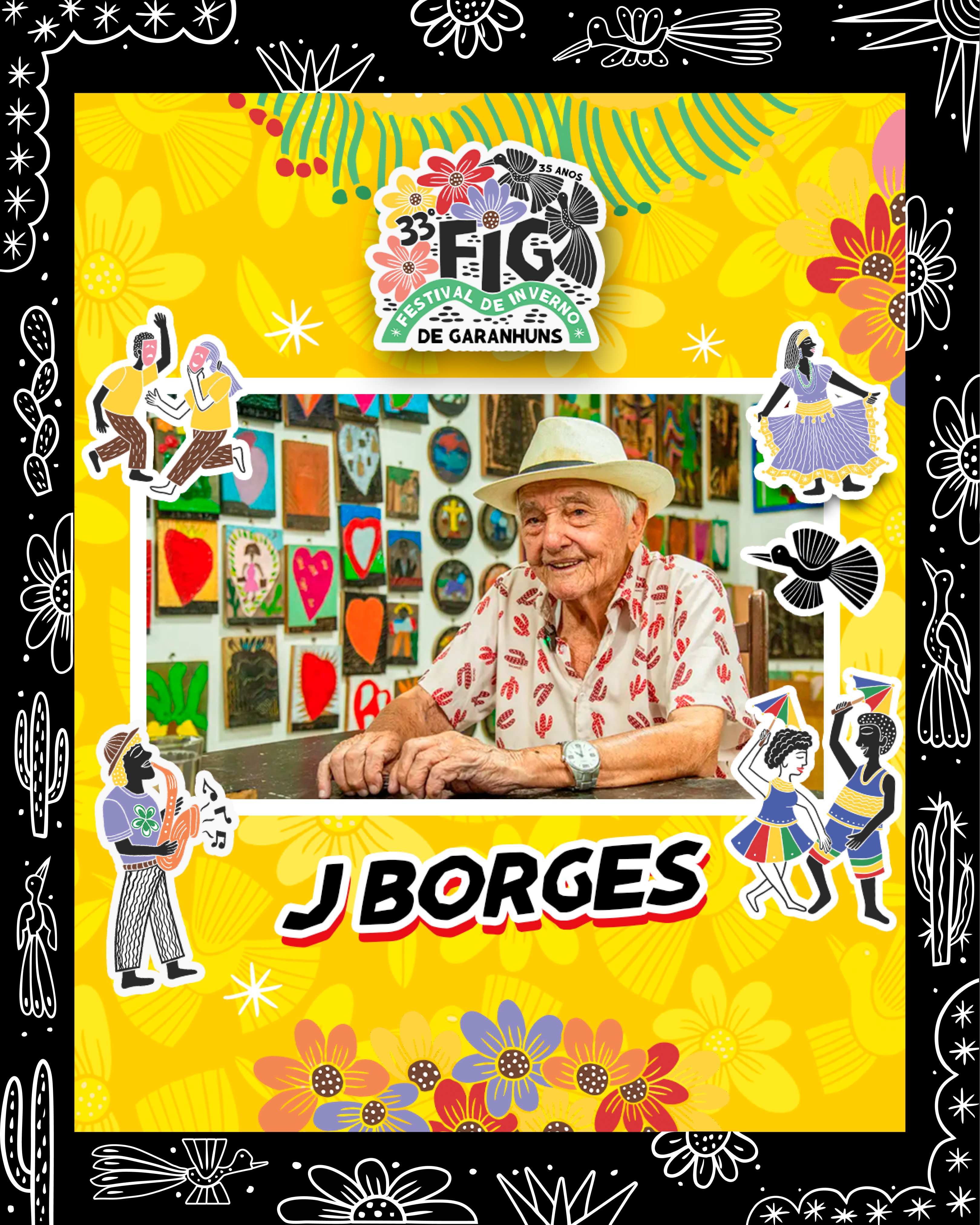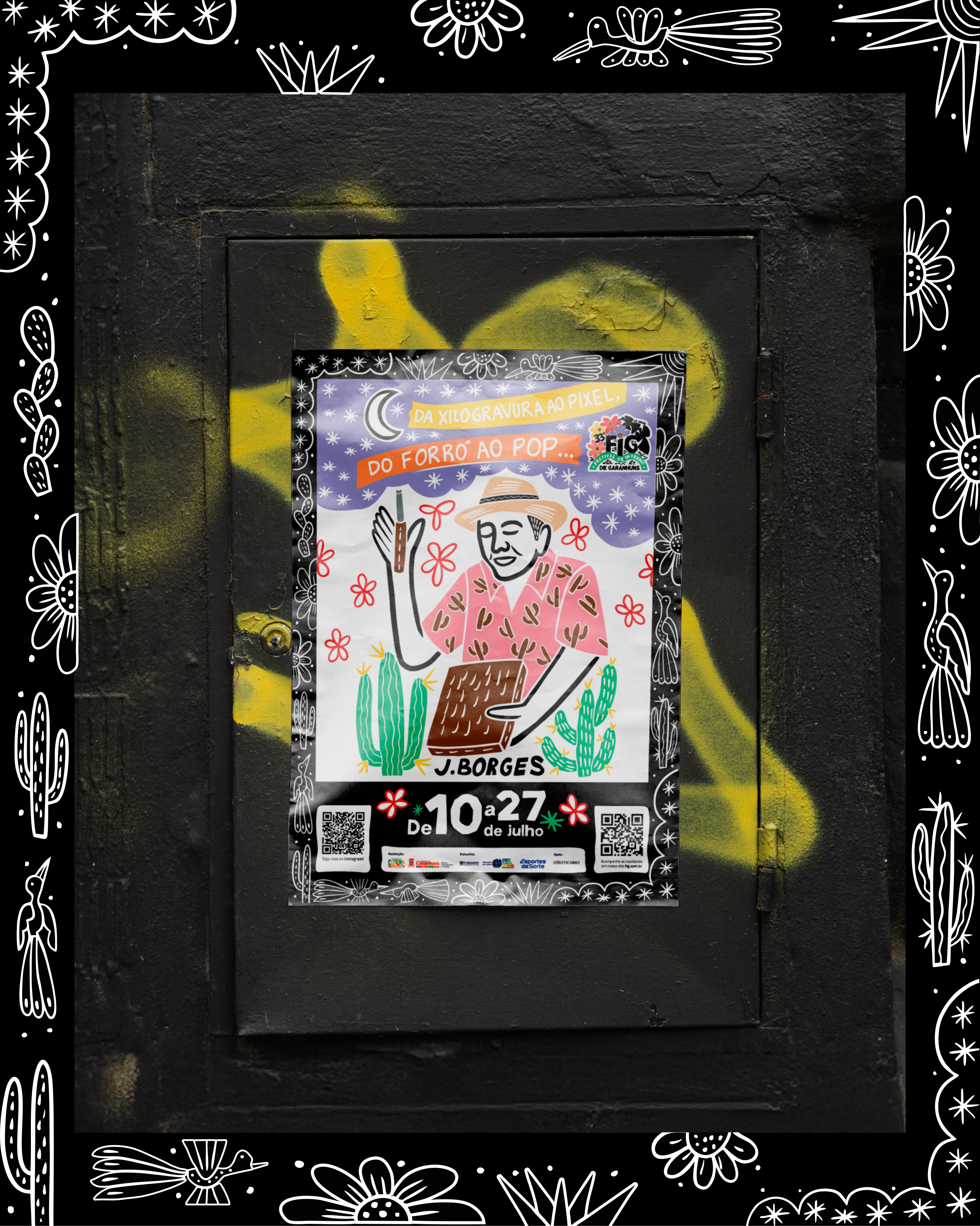 Nesta edição, o festival homenageou o mestre da xilogravura J. Borges, com a identidade visual assinada por seu filho, Bacaro Borges — cuja estética tradicional dialogou com a pluralidade do FIG, inspirada no traço e na alma da xilogravura.